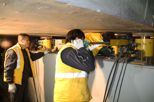 更換過程中,技術(shù)人員在橋梁工程師指導(dǎo)下,主要采取液壓同步頂升等科技手段,同步頂升需要更換的橡膠支座,換上新支座。截至目前,姚樓橋橡膠支座更換工作已全部完成,鹿樓沙河橋支座更換工作正在進(jìn)行,預(yù)計(jì)即日完成。