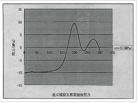 下支座的有限元分析。計算的結(jié)果曲線和試驗結(jié)果曲線的趨勢一樣,數(shù)值有差別,但是相差不大。在有限元計算時,支座底面采用剛性約束,模擬支座在墩臺上,忽略支座的鍋底變形的作用,支座底面面拉應(yīng)力如圖3一8所示:由圖3一8可見,最大壓應(yīng)力在支座中心部位。為一10MPa,最大拉應(yīng)力出現(xiàn)在橡膠與盆環(huán)交界處。為9.328lMPa。支座的壓應(yīng)力在半徑小于120IUm情況下變化一直很小,在 150mID處變化很大,呈極具上升,這主要是因為橡膠的側(cè)向力推缸盆底部所引起的。在接近Zooluln處應(yīng)力值達到最大,是因為橡膠向側(cè)向運動受到盆環(huán)約束,盆環(huán)相當于一個簡單的懸臂梁。在橡膠體橫向力作用下盆環(huán)與鋼盆底部交接處的應(yīng)力相應(yīng)的會很大。橡膠承受壓力,壓力小于橡膠的抗壓極限25MPa。鋼盆底部與盆環(huán)處受拉應(yīng)力作用