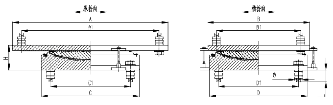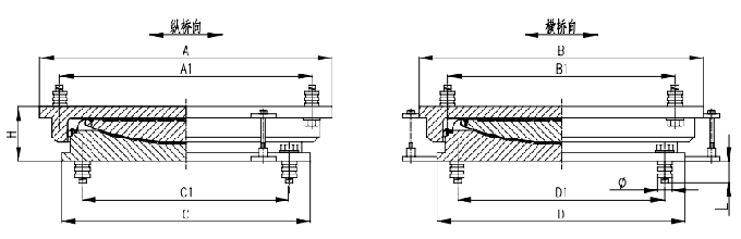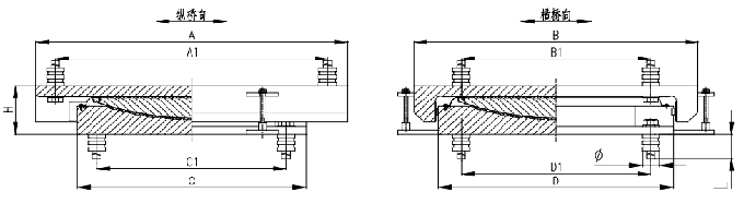 球型支座的水平位移是由上(支座)滑板與中座板上的平面四氟板之間的滑動(dòng)來(lái)實(shí)現(xiàn)的。另外,通過(guò)在上座板上設(shè)置導(dǎo)向板(槽)或?qū)颦h(huán)來(lái)約束支座的單向或多向位移,可以制成單向活動(dòng)球型支座和固定球型支座。